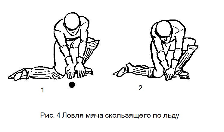 Отбивая летящие и катящиеся мячи в падении, вратарь делает быстрый рывок, падает на лед перекатом в сторону и вытянутой рукой задерживает или отбивает мяч .