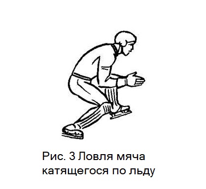 Для того чтобы поймать мяч, катящийся по льду, вратарь становится на одно колено, выставляя голень в сторону, наклоняется и ставит руки навстречу мячу, пальцы обращены вниз.