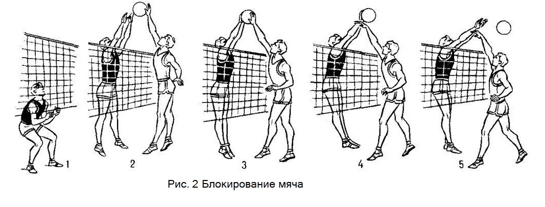 Блокирование. Это прием, обеспечивающий защиту против нападающих ударов противника. Техника блокирования складывается из перемещения к месту постановки блока, прыжка, постановки рук и приземления. Блокирующие выполняют перемещение приставными шагами. Определив место толчка, блокирующие принимают позицию готовности. Прыгать блокирующий может с места или после перемещения. Игрок энергично отталкивается, кратчайшим путем выносит руки вверх — они преграждают путь мячу. При близкой передаче к сетке блокирующий переносит руки через сетку и накрывает мяч (рис. 2).
